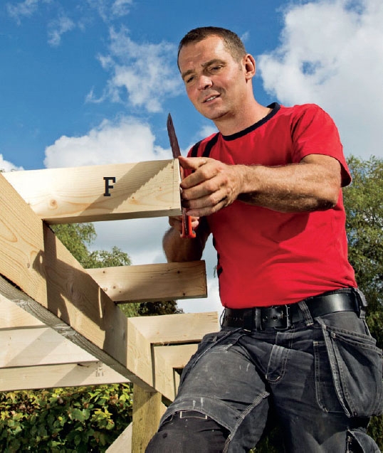 Hakkene skal være mindre, end du tror. Sav dem ca. 2,5 cm lavere end remmens højde, så taget ikke støder på. Her saves et hak i stolpen på 45 x 120 mm.
