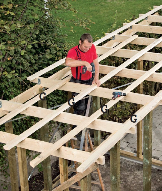 Når spærene er på plads og al vindafstivning er monteret, skal du til at lægge taget. Skær spærene (F) til i den endelige længde, og skru taglægter (G) på, så de ligger med den afstand, som producenten af tagpladerne anbefaler. I dette tilfælde er der tale om knap 50 cm.