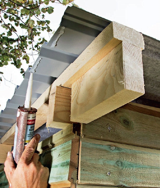Når tagpladerne er på plads, skal du lukke af for regnen med sternbrædder hele vejen rundt. Start med at skrue siderne på ind i taglægterne og sideklodserne (H), og lad brædderne rage ud bagtil. Skru så fronten på ind i side-bræddernes endetræ og til sidst bagsiden. Sav så alle bræddeender af, som rager udenfor, og du har en flot kant hele vejen rundt. Oven på sternbrædderne skrues en sternkapsel, som beskytter brædderne mod regn.