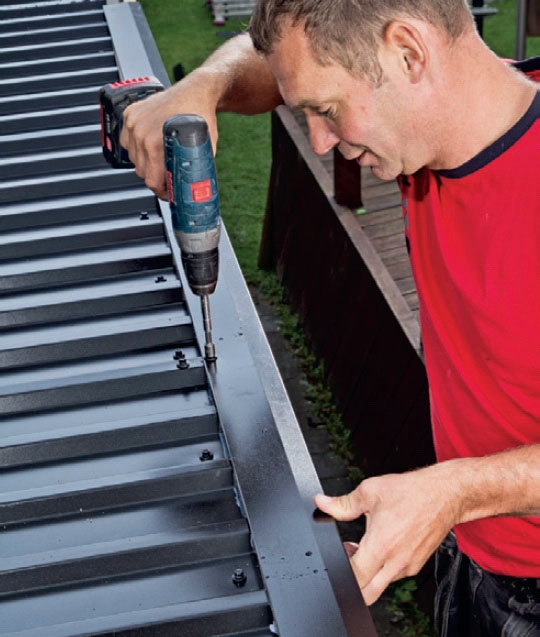 Skru tagpladerne på med de skruer, som følger med. De har skruespids, så der skal ikke bores for. Placer skruerne i bunden af bølgerne, og sæt moment på skruemaskinen, så du ikke maser skruen ned i pladen.