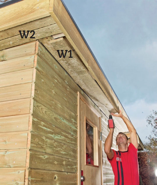 Skru facadebrædderne (X) på. Først skal du fjerne den bageste del af noten på det nederste bræt, så det kan gå ned over rottesikringspladerne og udgøre vandnæse.