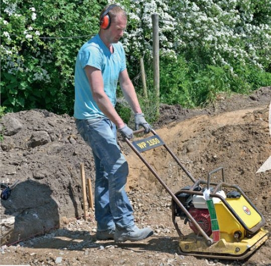 Du bør bruge en maskine på 90-100 kg for at komprimere i dybden. For kun at få et tyndt lag afretningsgrus skaber vi en plan overflade 3-4 cm under flisernes bund.
