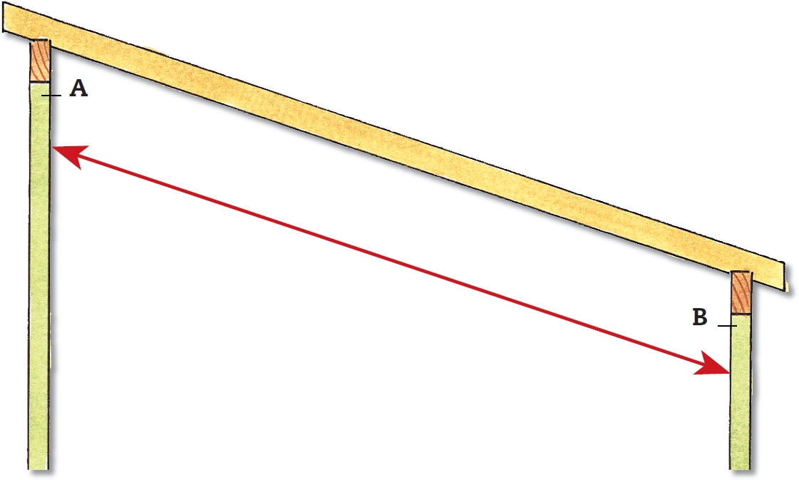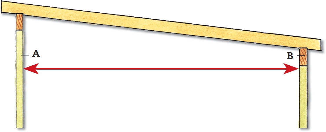 Spændvidden på tag med lav hældning er afstanden mellem de to stolper, målt vandret. Altså afstanden A-B.