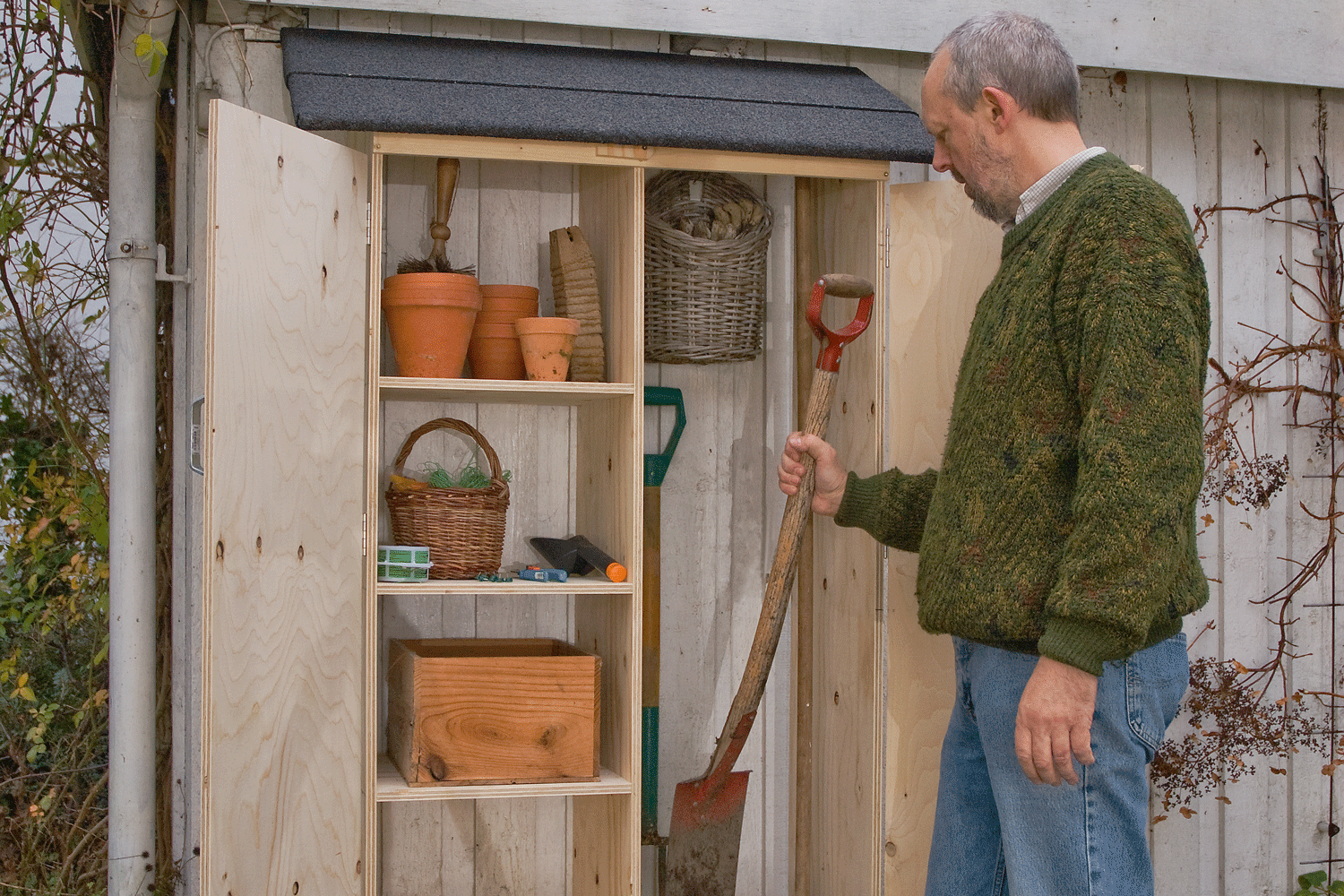 Det er nemmest at save delene ud med en dyksav, men du kan også bruge en stiksav eller en fukssvans. Husk at vende den pæne side nedad, når du saver, for savsnittet bliver renest nederst. Sav sider og døre ud, så træets årer er på den lange led, og regnvandet lettere kan ledes væk. Byggemarkedet kan også save pladerne ud, hvis du har en skæreplan. Så tager det kun et par timer at samle skuret.