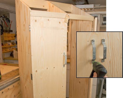 Skuret her samles med 50 mm lange skruer, og det er en god idé at bore for til dem. Krydsfineren er ikke slem til at flække, hvis du skruer mere end 5 cm fra kanten, men det letter samlingen, når du kan holde med den ene hånd og skrue skruer i, der allerede er sat løst i de rigtige steder, med den anden hånd.