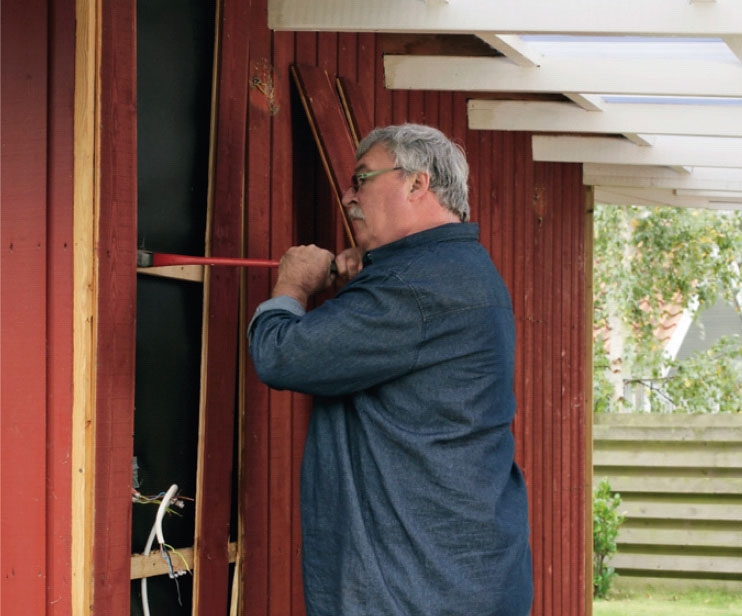 Beklædningen fjernes med et koben. Da vi ikke vil genbruge den, går det hurtigt. Er der ført elkabler i væggen, skal du kontakte en autoriseret elinstallatør, der kan koble kablerne fra og forberede det kommende elarbejde.