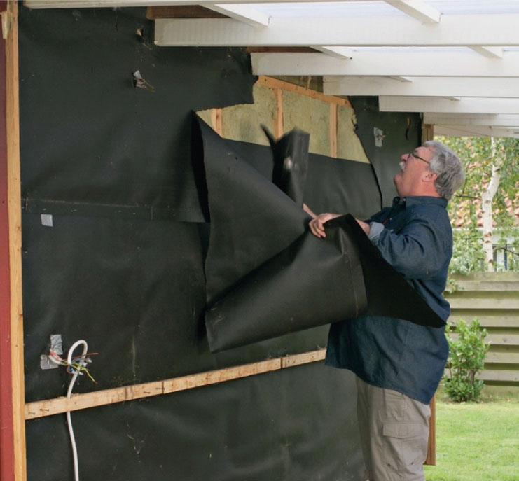 Når vi har fjernet resten af vindpappet og de gamle afstandslister, går vi i gang med at lægge det ekstra lag isolering uden på den oprindelige væg.