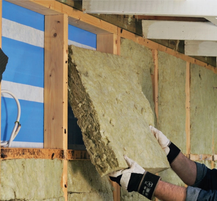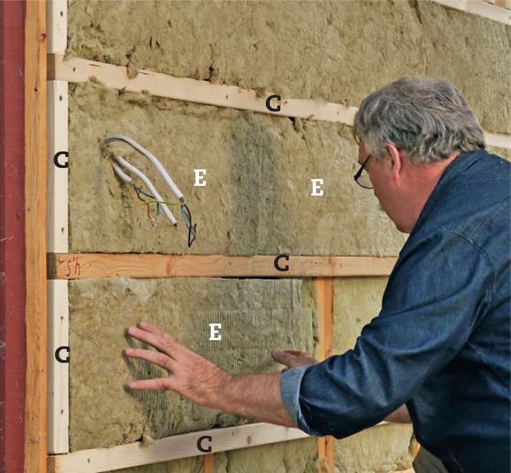 De smalle felter fyldes op med 50 mm mineraluldsmåtter (E). De passer så tilpas stramt, at de bliver siddende af sig selv. Da mineraluld ikke er farligt, kan du arbejde uden handsker, men det er en rigtig dum idé, for fibrene klør.