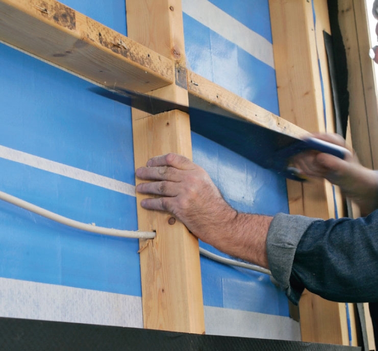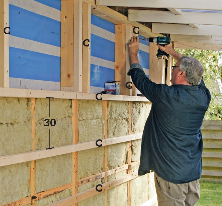 Laget af afstandslægter (C) fastgøres med 5 x 80 mm skruer. Ud over lægter i hele væggens yderkant og omkring vinduerne lægges de vandret med en indbyrdes afstand på 30 cm.