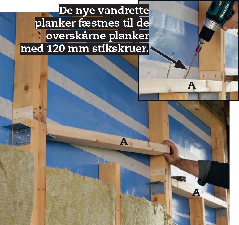 De nye lodrette planker (B) gør vi fast med lange stikskruer i de vandrette planker over og under dem. Her klarer vi os uden beslag, for vægten føres direkte fra træ til træ, skruerne holder det bare på plads.