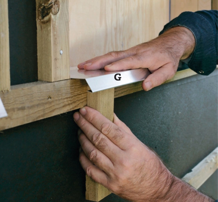 Uden på vindpappet skruer vi et lag afstandslister (D) oven på de vandrette lægter (C). De skal sikre ventilation bag beklædningsbrædderne, så de deles i korte stykker, der sættes med lidt afstand imellem.