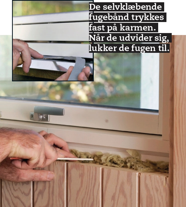 Fugerne lukkes udvendigt og indvendigt. Når kilerne er fjernet, stoppes mineraluld ind i fugen. Indvendigt lukker vi af med en akrylfuge, der lægges oven på et rundt fugebagstop. Udvendigt lukker vi med ekspanderende fugebånd.