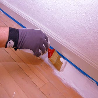 Træet skal først grundes med en hæftegrunder, der mætter træet og sikrer, at gulvmalingen hæfter ordentligt. Mal først med pensel langs med kanterne, som du har dækket af med afdækningstape.