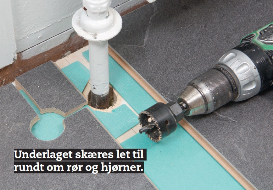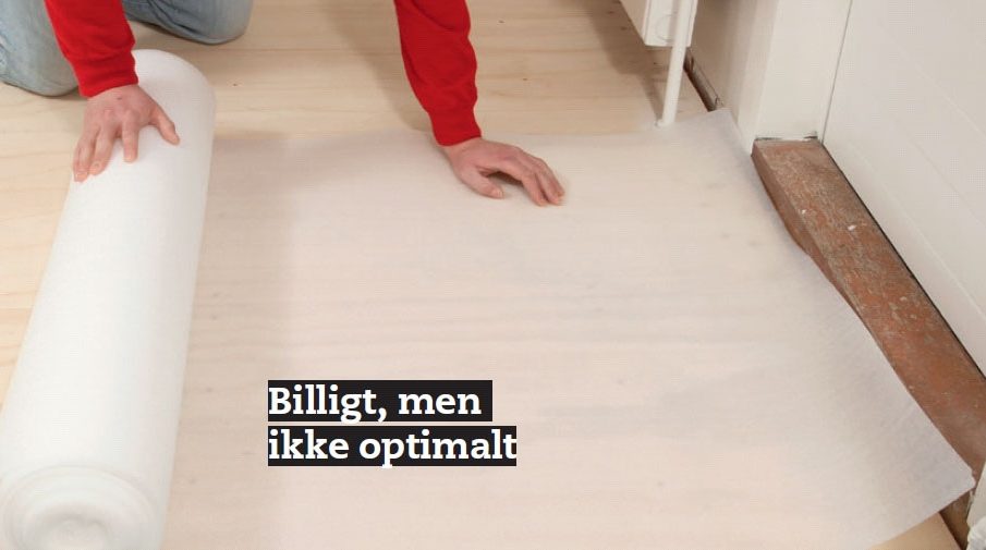 Her er det en såkaldt akustisk måtte fra Pergo, der lægges på. Den består af en elastisk polymer-måtte, som er klæbet sammen med en særlig fugts pærrende metalfolie.