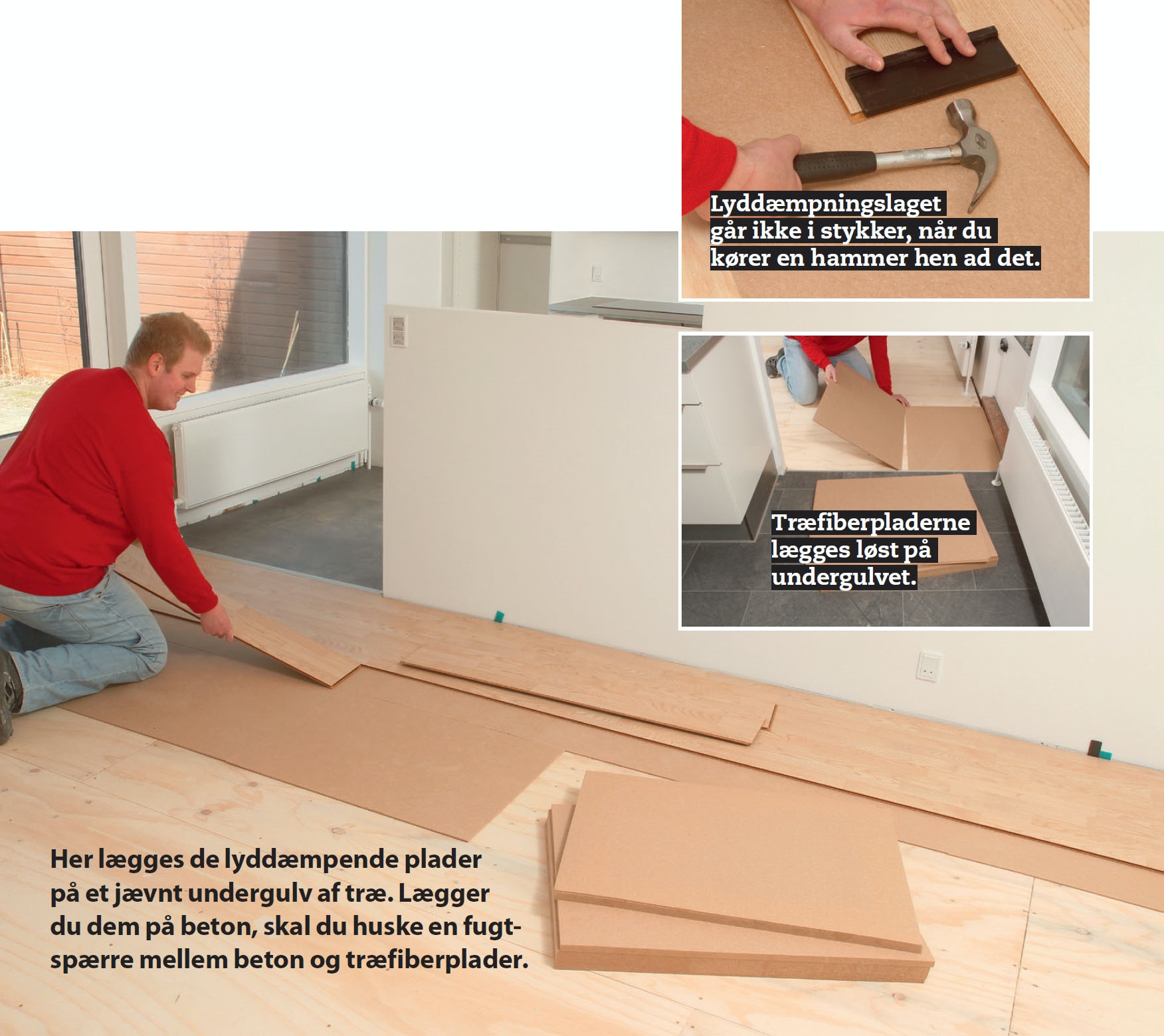 Vil du have lyddæmpet et lidt ujævnt gulv, skal du lægge træfi-berplader under dit laminatgulv. Pladerne kan optage op til 3 mm’s ujævnheder i undergulvet, samtidig med at de opsuger lyd.