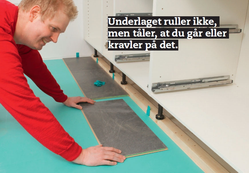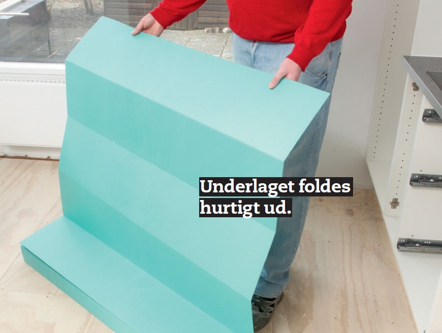 Her anvender vi Pergos Whisperwalk-Comfort-plader, der både dæmper støjen fra det hårde gulv og gør det mere behageligt at gå på. Pladerne er af hårdt pressede træfibre, det, vi også kender som blød masonit. Pladerne lægges bedst på tværs af laminatgulvet, så du undgår, at samlinger på langs ligger oven på hinanden.
