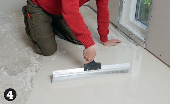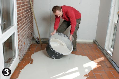 Hæld den færdigrørte nivelleringsmasse ud på gulvet. Start ved de dybeste lunker, de skal måske fyldes lidt op først. Nu forsvinder dine streger, og du har kun skruerne at styre efter.