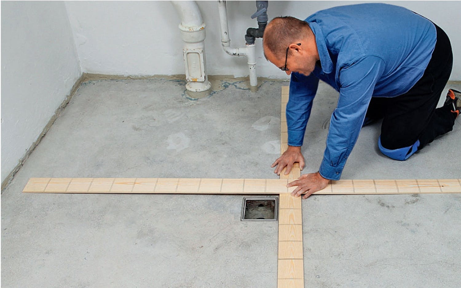 Ved at arbejde i vinkelrette hjørner fra midten af gulvet ud mod væggene gør du det let at lægge fliserne præcis som planlagt. Hjørnerne skaber du ved at skrue planker fast i gulvet efter et fast system, og derfra styrer du fugebredden med afstandsklodser.