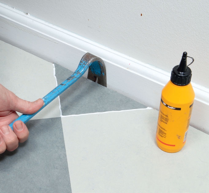 Fjern fejelister og evt. fodpaneler. Her er sprækken mellem det gamle vinylgulv og sokkel/fodpanel dækket med fejelister af plast. De lirkes forsigtigt af.