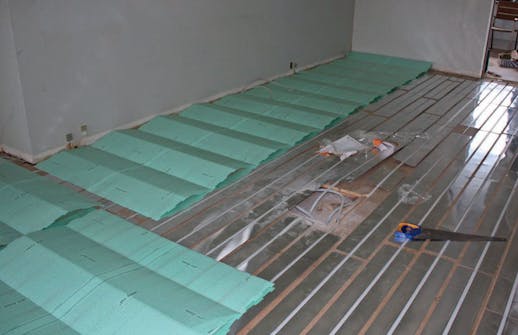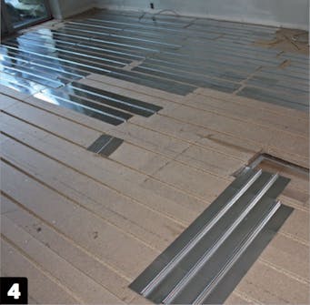 Ved at skrue sporplader fast i gulvstrøerne får du et solidt undergulv. Pladerne er konstrueret med en masse langsgående riller, som varmefordelingspladerne passer ned i. Du bliver dog nødt til at fræse nogle vendespor til gulvvarmeslangen, så den kan slå en blød bue, hver gang den skal retur.