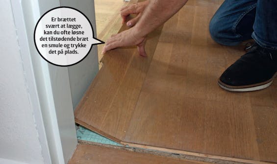 Ret ind undervejs, og træd gerne et par skridt tilbage, så du får en fornemmelse af, om gulvet ligger lige. Man kan nemlig nemt stirre sig blind på gulvlægningen, når man ligger på alle fire og arbejder derudad.