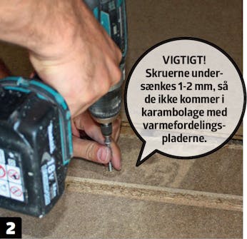 Det er vigtigt, at du skruer pladerne fast i alle de underliggende strøer, så de får ordentligt fat. Klikgulvet bliver nemlig ikke skruet fast.