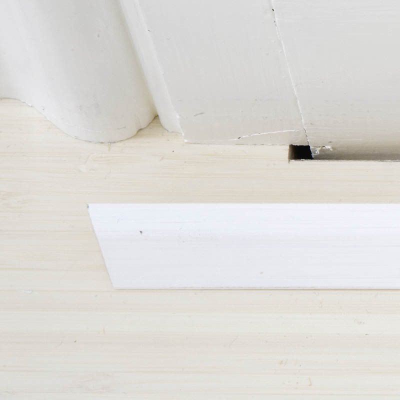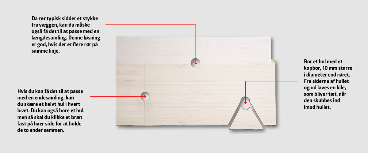 Det sidste bræt skal skæres til ved væg eller dør (som her). Her laves udskæringerne i et helt bræt. Du kan også lave det med en endesamling midt i døren. I begge tilfælde skal du være omhyggelig med opmålingen.