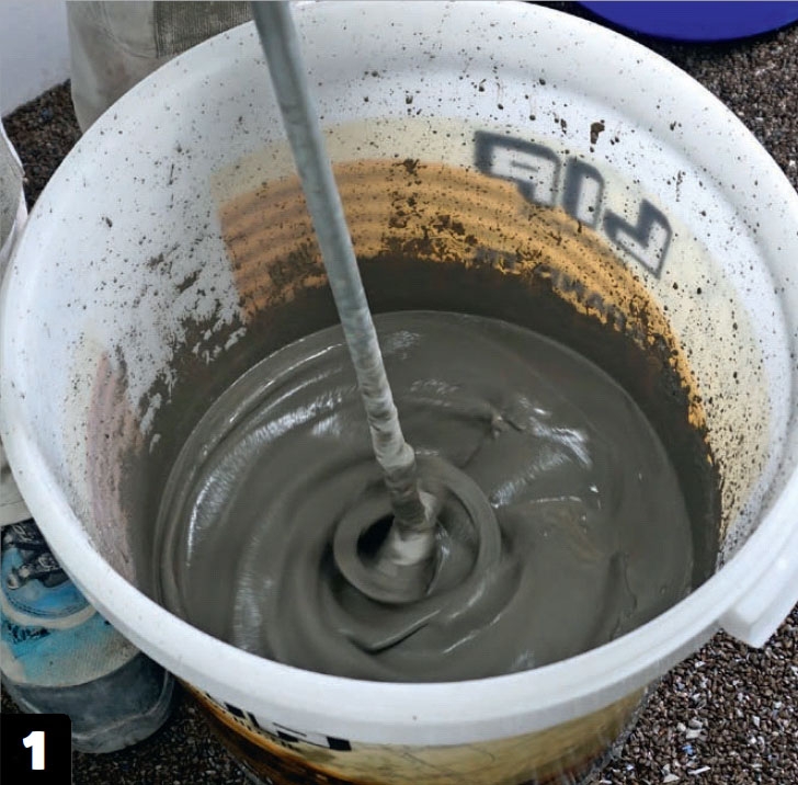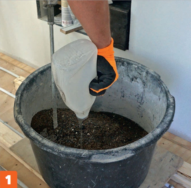 Kom hele posens indhold i en stor murerspand. Posen indeholder også en flaske bindemiddel og en brugsanvisning. Bland kun en pose ad gangen, da det hærder hurtigt. Tilsæt herefter hele flaskens indhold, og rør, indtil granulatet glinser.