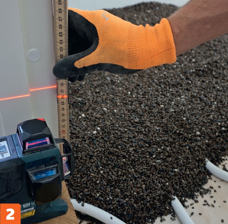 Det første, du skal gøre, er at beslutte dig for en sluthøjde på dit gulv - her er en krydslaser en god hjælp. Derefter er det bare at blande granulat og bindemiddel grundigt og derefter fordele det i et så jævnt lag som muligt. Det vigtigste er, at der ikke er toppe eller andre ujævnheder, der rager op over din sluthøjde.