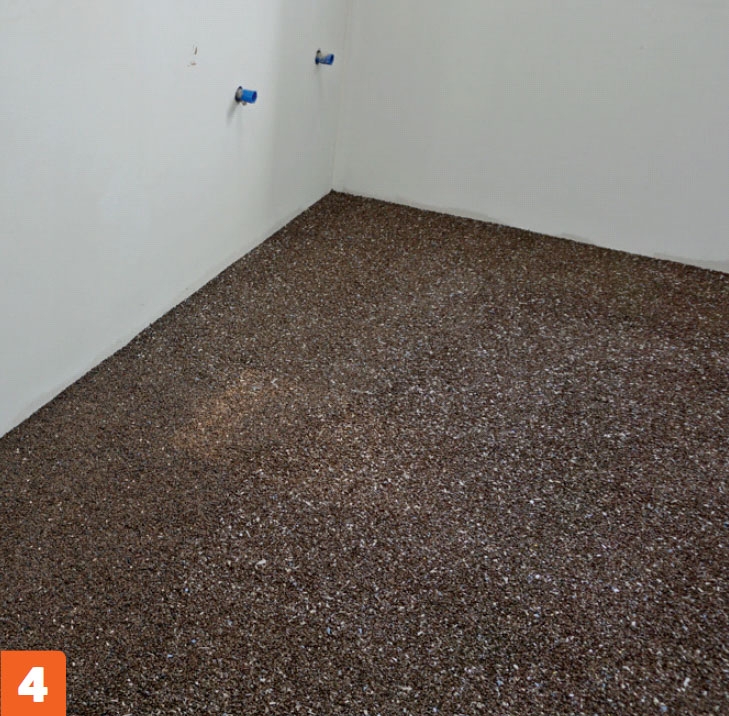 Thermodyn består af granulat og er derfor ganske luftig i sin konsistens. For at lukke disse lufthuller vælger vi at give gulvet to lag selvnivellerende gulvspartelmasse.