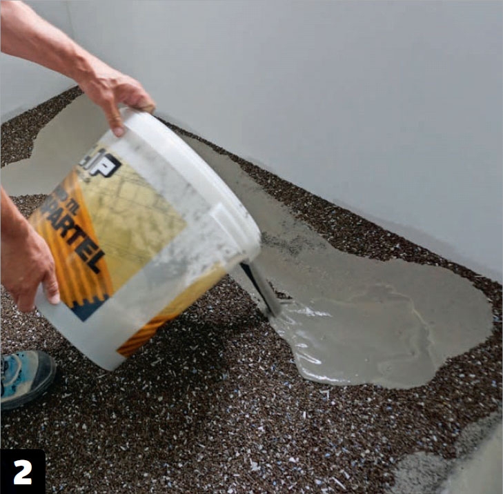 Det første lag spartles jævnt ud over granulatet. Blandingen skal have en konsistens som tyk grød, da den skal lægge sig oven på granulatet og ikke bare sive ned i det. Konsistensen af det næste lag skal være væsentlig tyndere, så det nemt kan løbe sammen. Fordel det fx med en løvrive og en pigrulle.