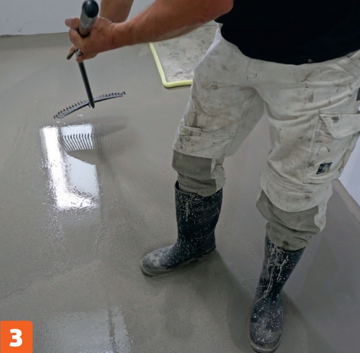Det gode ved selvnivellerende spartelmasse er, at den langt hen ad vejen selv flyder sammen. Det kan dog betale sig at fordele spartelmassen med en rive og senere en pigrulle, så den kommer ud i alle kroge af gulvet.