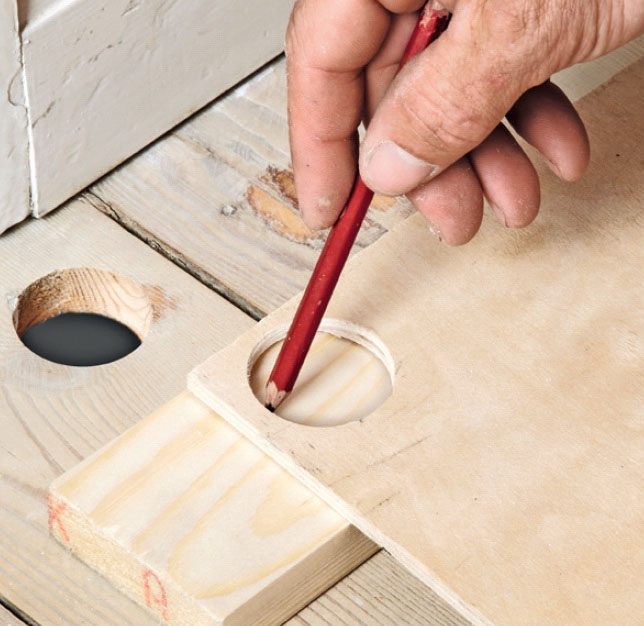 Læg en krydsfinerplade oven på hullet, og bor gennem pladen med et bor, der er lidt større end hullet. Tegn proppen op på et bræt, og sav den ud.