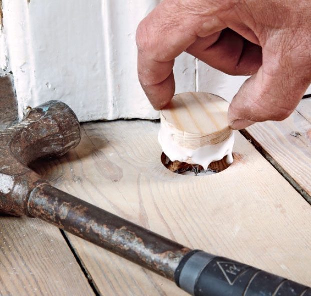 Den pæneste løsning får du ved at lukke hullet med en prop, som du borer ud i et stykke træ og limer fast i hullet. Når du sliber den til og måske også gør den lidt “beskidt”, vil du ikke lægge mærke til reparationen.