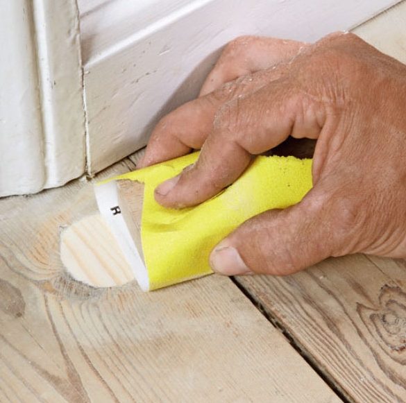 Smør trælim på proppen, og bank den på plads i hullet med en klods og en hammer. Slib kanterne først med groft slibepapir, og tjek, at den passer.