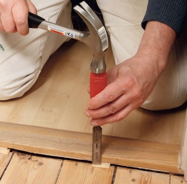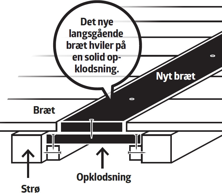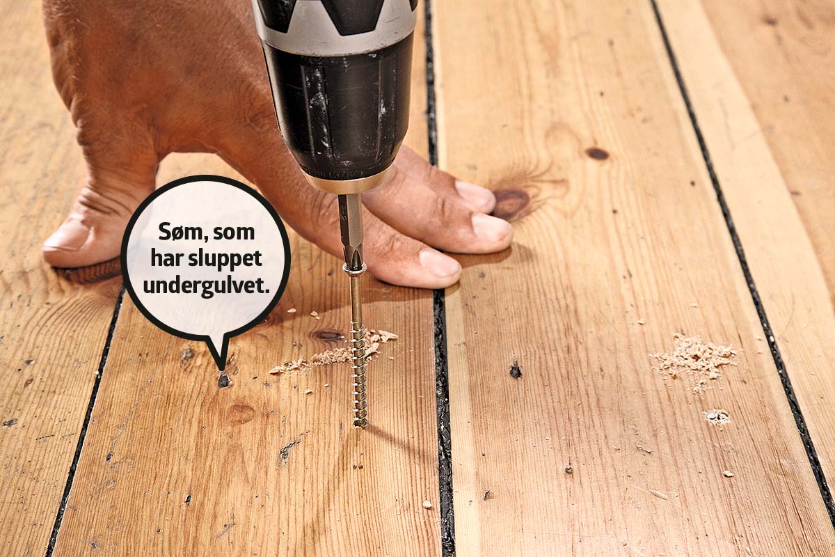 Det bliver hurtigt et dagligt irritationsmoment, hvis dørtrinnet siger lyde, hver gang du træder på det. Årsagen er, at brættet ikke er understøttet godt nok og giver sig lidt, når du træder på det. Hvis du vil slippe for knirkelydene, skal du klodse det ordentligt op.