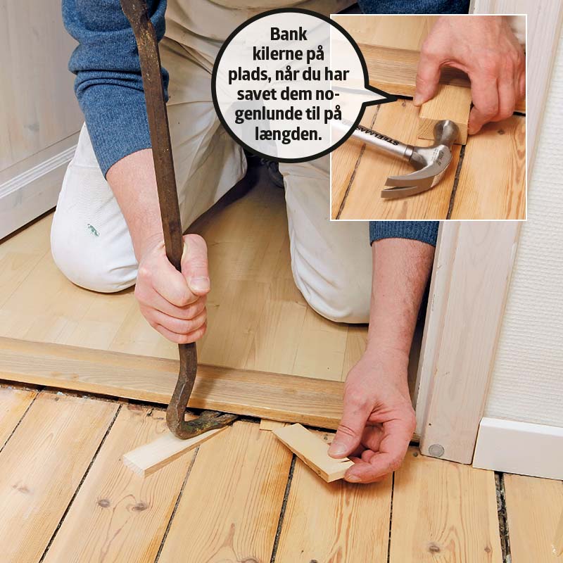 Klods trinnet op med kiler, der sættes parvis midtpå og i siderne. Første kile skubbes ind med den tykke ende først, den anden modsat ovenpå. Tjek, at trinnet er lige.