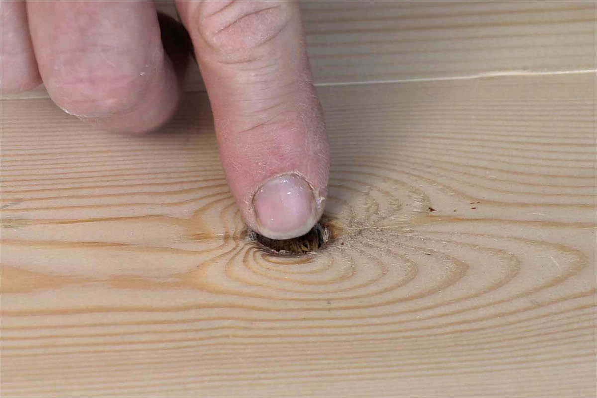 Hvis du er så heldig at have den knast, der er faldet ud, kan du godt have held til at lime den fast igen. Men ellers må du erstatte knasten med en prop. Her gælder det om at finde et bræt, der ligner gulvet.