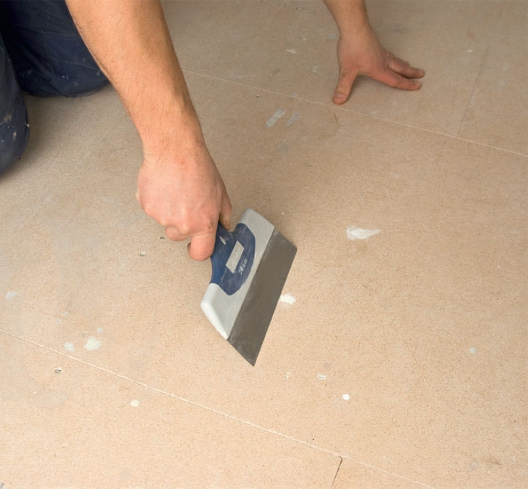 Fjern alle ujævnheder på gulvet. Brug en spartel til at skrabe klatter af spartelmasse eller lignende væk. Tjek, om der er skruer eller søm, der stikker op. Hvis underlaget er ujævnt, kan det være nødvendigt at spartle eller slibe gulvet.