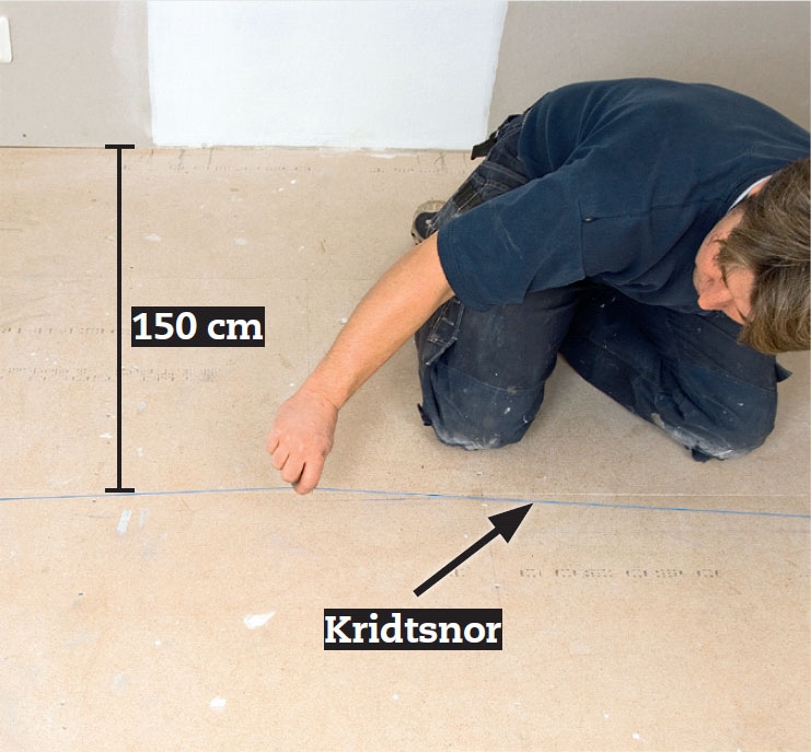 Kontroller, at rummet er vinkelret. Mål 150 cm ud fra væggen i begge hjørner i den side, hvor du skal lægge første bræt. Marker linjen med en kridtstreg. Det er den kontrollinje, du skal bruge, når du lægger gulvet.