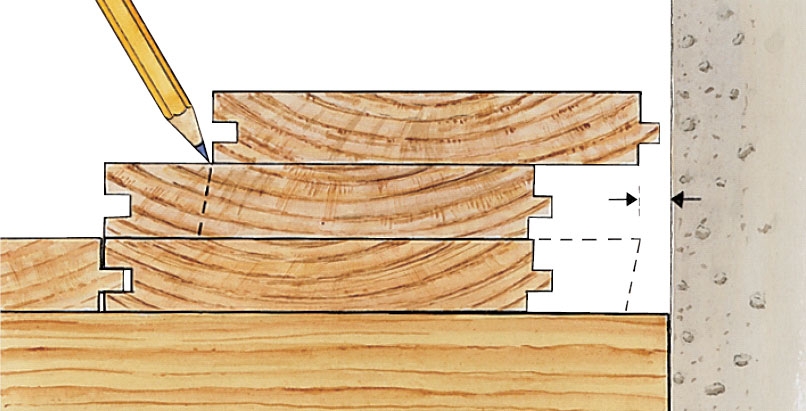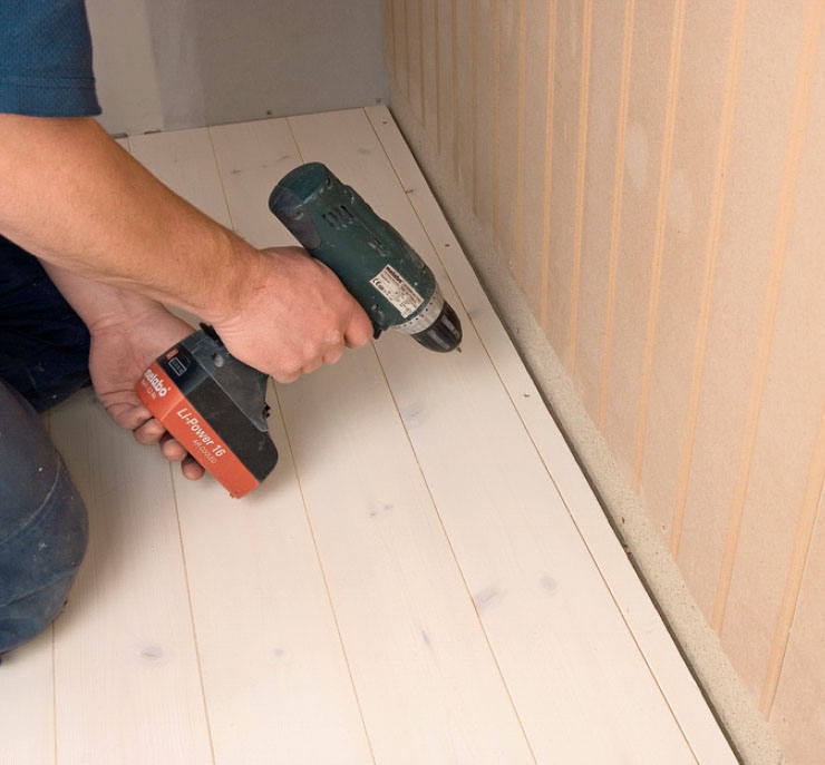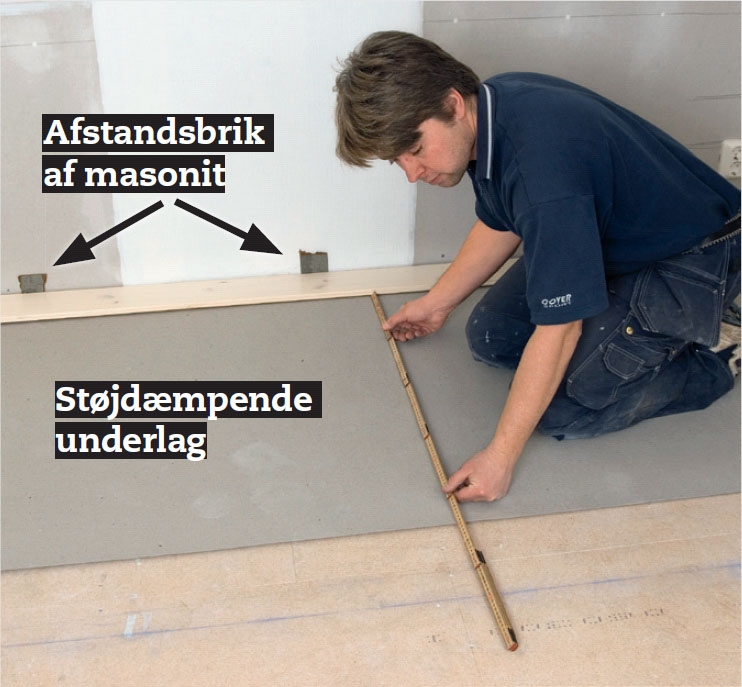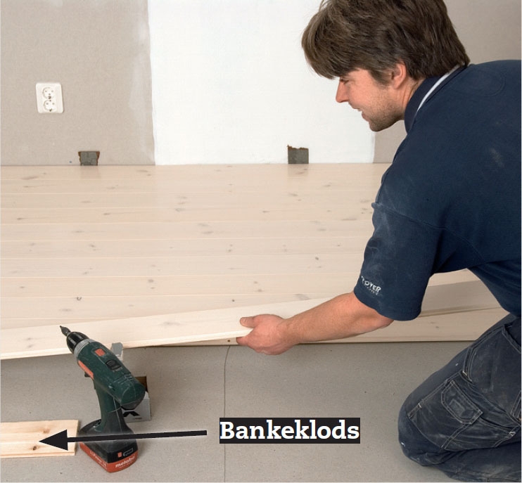 Det første bræt lægges med noten ind mod væggen og skrues fast. Husk at gøre plads til en bevægelsesfuge. På langsiden bør den være 5-7 mm, mens den gerne må være tyndere ved endetræ.