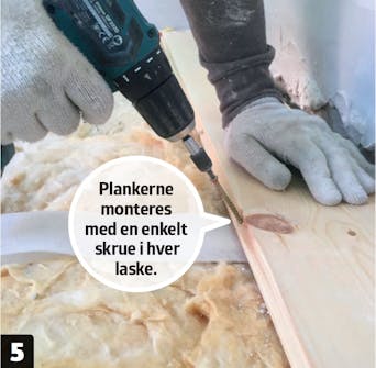 Fortsæt med at lægge plankerne efter samme princip. Det går stærkt, når først du har lært teknikken med at lægge planken til rette, banke den på plads og skrue den fast til de respektive lasker.