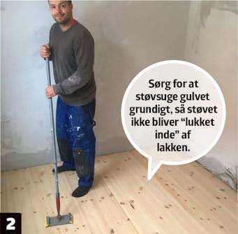 Slib gulvet let med korn 180, og støvsug herefter gulvet grundigt. Giv det endnu et lag lak, og gentag processen, til plankerne føles glatte og behagelige. Vi endte med at give gulvet fire lag.