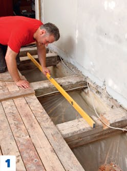 Beslut, hvor højt det nye gulv skal ligge. Mål hele gulvet over, så du kan kan løfte resten op til samme plan.