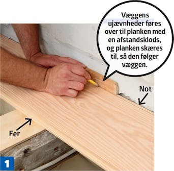 Første planke lægges med notkanten mod væggen. Bredden tilpasses, så de skal skæres omtrent lige meget af planerne her og i den modsatte side, med mindre der kun skal fjernes en smule af sidste række.
