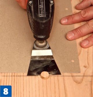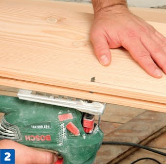 Planken passes til med en stiksav. Skær nedefra, så du undgår, at træet flosser på oversiden. Skal du lave lange snit, der er helt lige, går det hurtigere med en rundsav.
