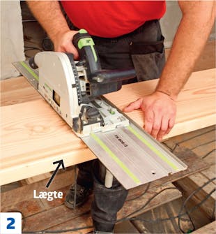 De lange, tunge planker er ikke lige til at få op i en kap-geringssav. Det hurtigste er at anvende en dyksav med føringsskinne, som rettes ind med et vinkelanslag eller en vinkel. Skinnen spændes fast med skruetvinger.