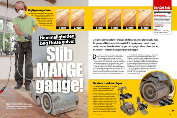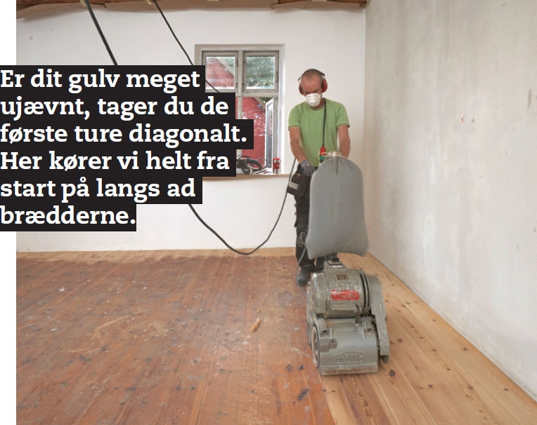 Og meget vigtigt: Du skal dykke alle søm og dreje alle skruer 2-3 mm ned i gulvet. Der skal ikke mere end en enkelt dum dykker til at flå et stykke slibepapir til små 100 kroner i stykker.