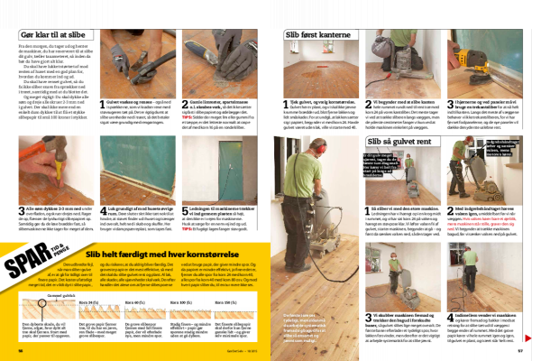 Slibesporene skal fjernes - ved at slibe dem ned med finere slibepapir, som efterlader nye spor. Det fine slibepapir, du skal slutte af med, ville være alt for længe om at fjerne de groveste spor, så man sliber med stadig finere papir. Om du vil slutte af med 150, 180 eller måske finere papir, afgør du selv - på gulvet her er det passende med korn 150.