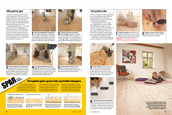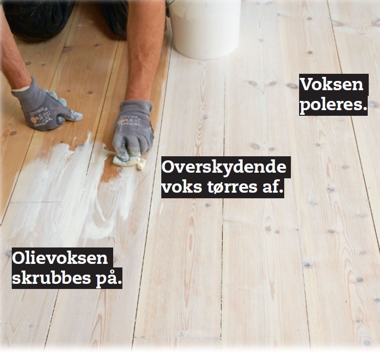 Behandlingen kan være så enkel som nogle gange vask med en lækker, fed sæbeblanding, og den kan være med olie, voks, lak - eller en kombination af flere behandlinger som her, hvor vi giver gulvet en blanding af linolie og bivoks. Olien trænger ned og imprægnerer træet i dybden, og voksen danner en tynd film på overfladen af træet.